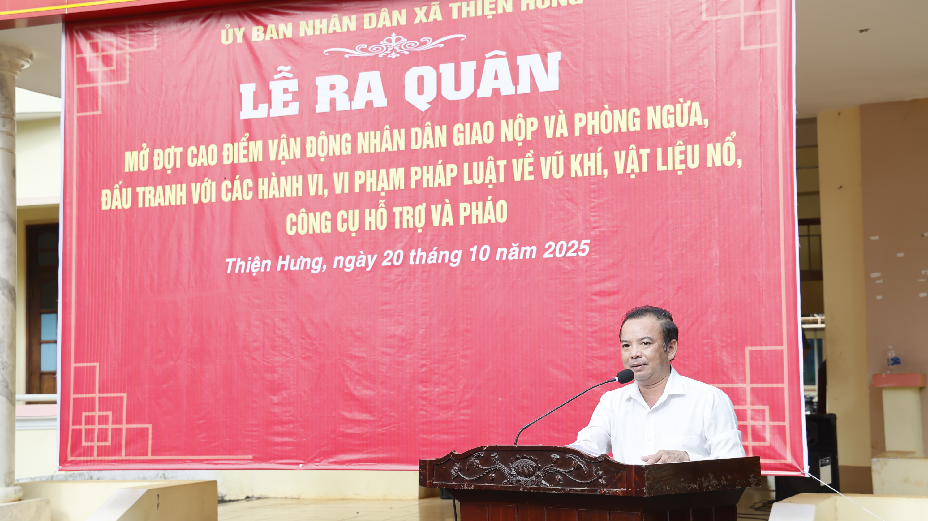 Phát biểu chỉ đạo tại buổi lễ, Phó bí thư, Chủ tịch UBND xã Thiện Hưng Nguyễn Minh Phong nhấn mạnh: Đợt cao điểm này là nhiệm vụ chính trị quan trọng, đòi hỏi sự vào cuộc quyết liệt của cả hệ thống chính trị, đặc biệt là vai trò nêu gương của cán bộ, đảng viên trong việc tuyên truyền, vận động Nhân dân tự giác giao nộp và tố giác các hành vi vi phạm. Mỗi người dân hãy nâng cao ý thức, chung tay giữ gìn bình yên từ khu dân cư, góp phần bảo đảm an ninh trật tự - an toàn xã hội.