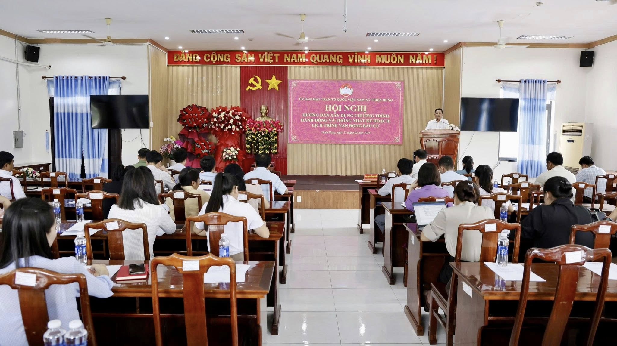 Chiều 27-2, Ủy ban MTTQ Việt Nam xã Thiện Hưng tổ chức hội nghị hướng dẫn xây dựng chương trình hành động vá thống nhất kế hoạch, lịch trình vận động bầu cử của người ứng cử đại biểu HĐND xã, nhiệm kỳ 2026–2031. Dự hội nghị có đồng chí UVBTV Đảng uỷ và các đồng chí tham gia ứng cử đại biểu HĐND xã Thiện Hưng nhiệm kỳ 2026-2031.