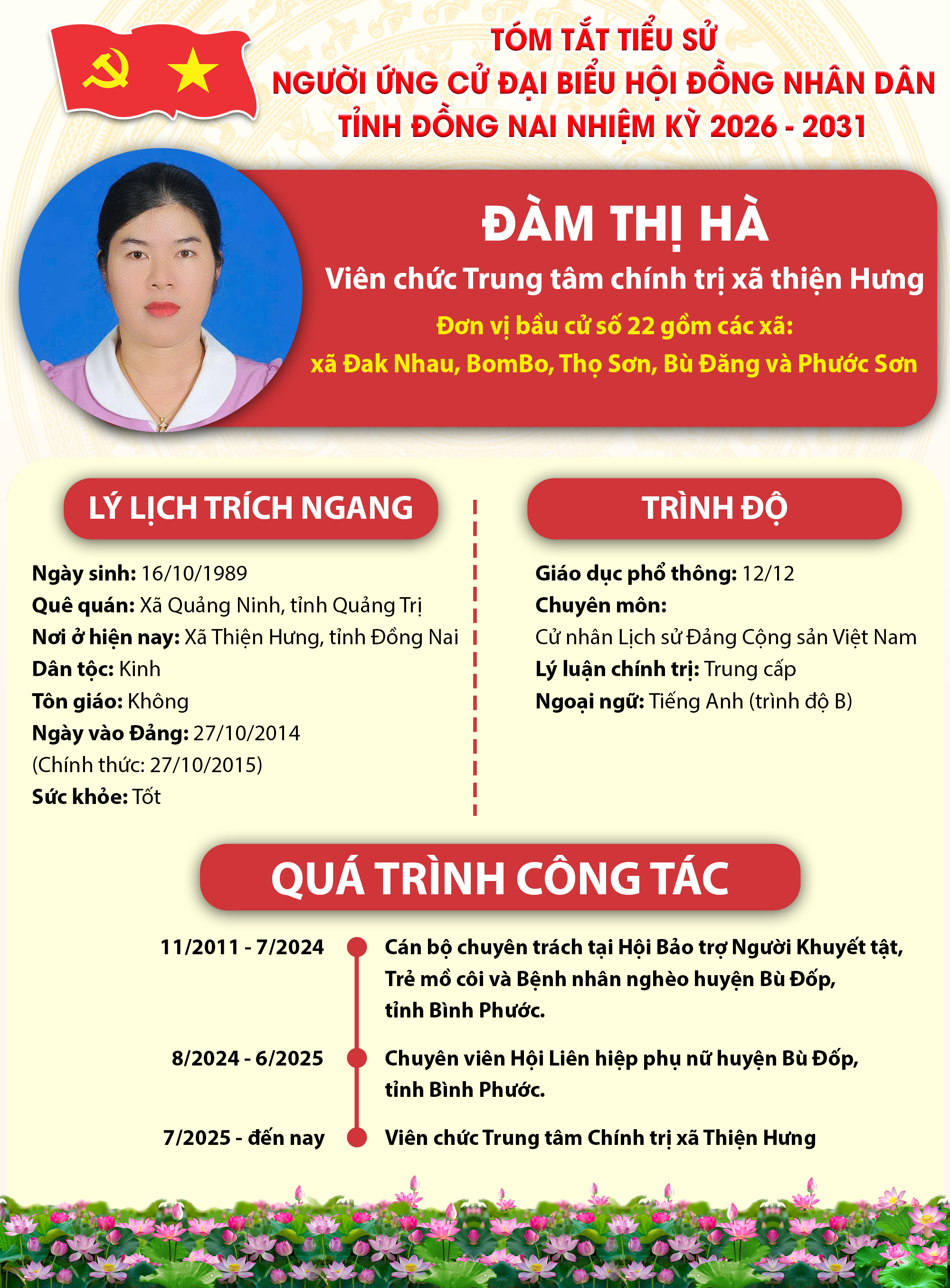Thực hiện Nghị quyết số 106/NQ-UBBC ngày 15/02/2026 của Ủy ban Bầu cử tỉnh Đồng Nai về việc công bố và phân bổ những người ứng cử đại biểu Hội đồng nhân dân tỉnh Đồng Nai khóa XI, nhiệm kỳ 2026–2031, xã Thiện Hưng có 02 ứng cử viên tham gia ứng cử đại biểu HĐND tỉnh.