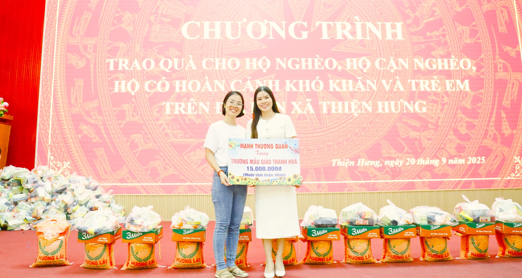 Cũng tại chương trình Công ty TNHH Cung ứng Phát Nguyên đã trao hỗ trợ 15 triệu đồng cho Trường Mẫu giáo Thanh Hòa xã Thiện Hưng để phục vụ mua sắm dụng cụ giảng dạy.