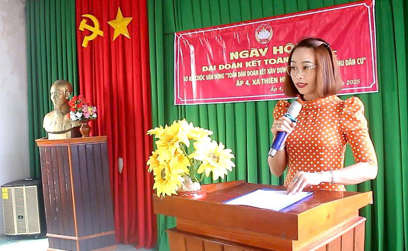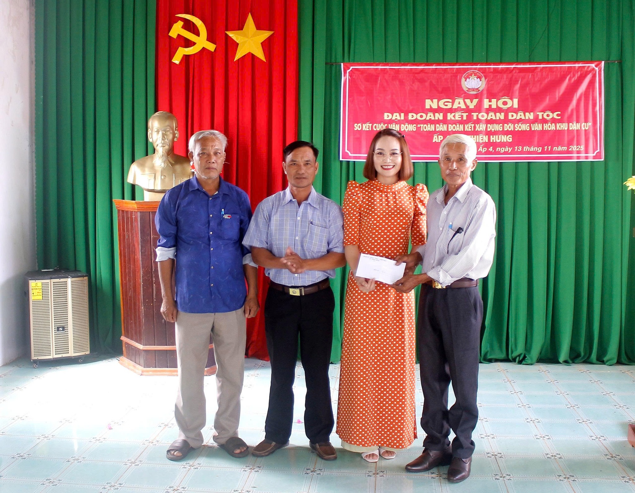 Phát biểu tại ngày hội đồng chí Phan Thị Thu Trang – Phó Chủ tịch UBND xã Thiện Hưng đã chúc mừng, ghi nhận những kết quả nổi bật của nhân dân ấp 4 trong năm qua; đồng thời thay mặt Đảng ủy, HĐND, UBND và Ủy ban MTTQ Việt Nam xã Thiện Hưng trao phần quà lưu niệm cho Ban điều hành ấp 4.
