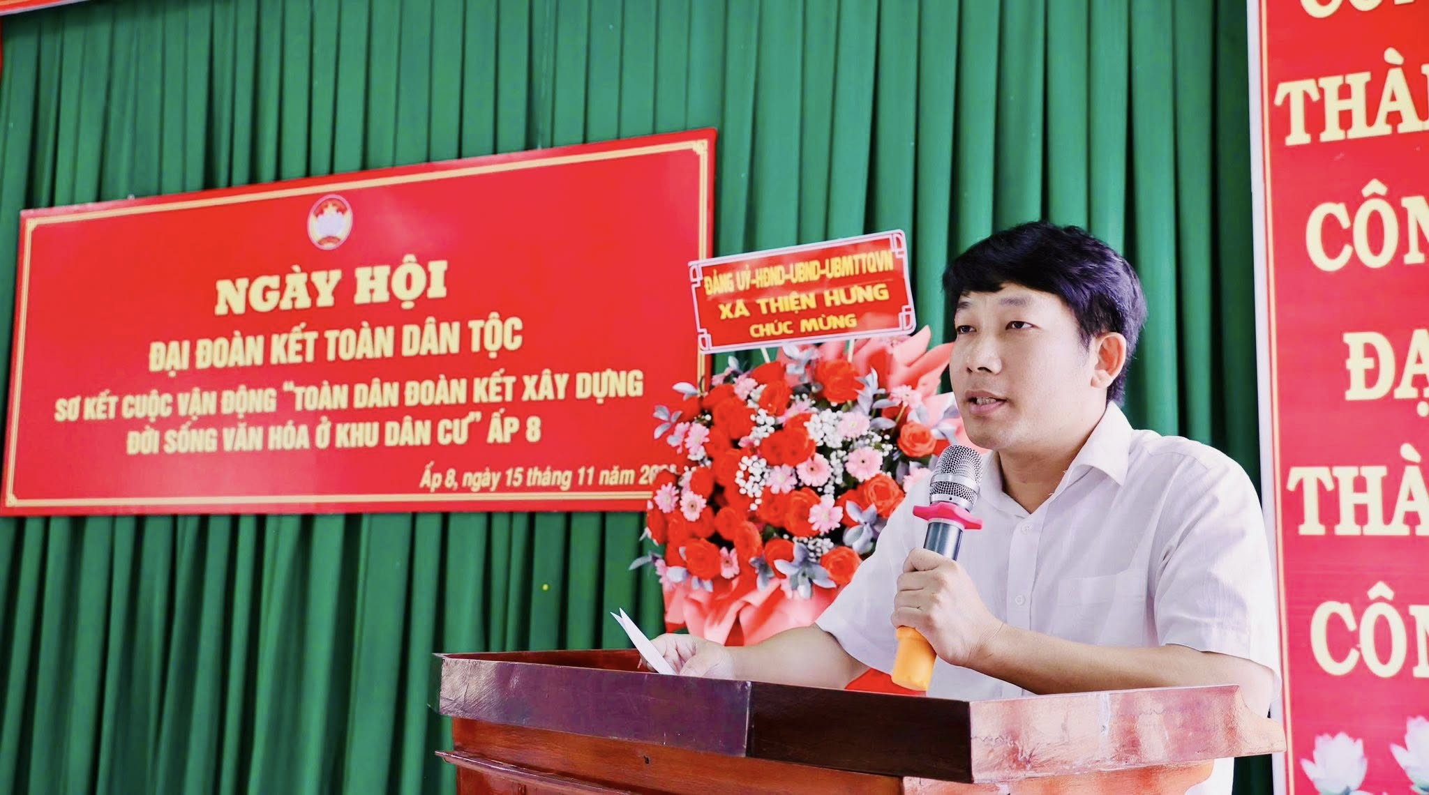 Phát biểu chúc mừng tại ngày hội, đồng chí Đặng Hà Giang – Tỉnh uỷ viên, Bí thư Đảng uỷ, Chủ tịch HĐND xã Thiện Hưng đánh giá cao những nỗ lực của cấp ủy, Ban Công tác Mặt trận và toàn thể nhân dân ấp 8. Phát huy tốt vai trò của hệ thống chính trị và sự đồng thuận của nhân dân trong xây dựng đời sống văn hóa, giữ gìn an ninh trật tự và xây dựng nông thôn mới – khu dân cư kiểu mẫu.