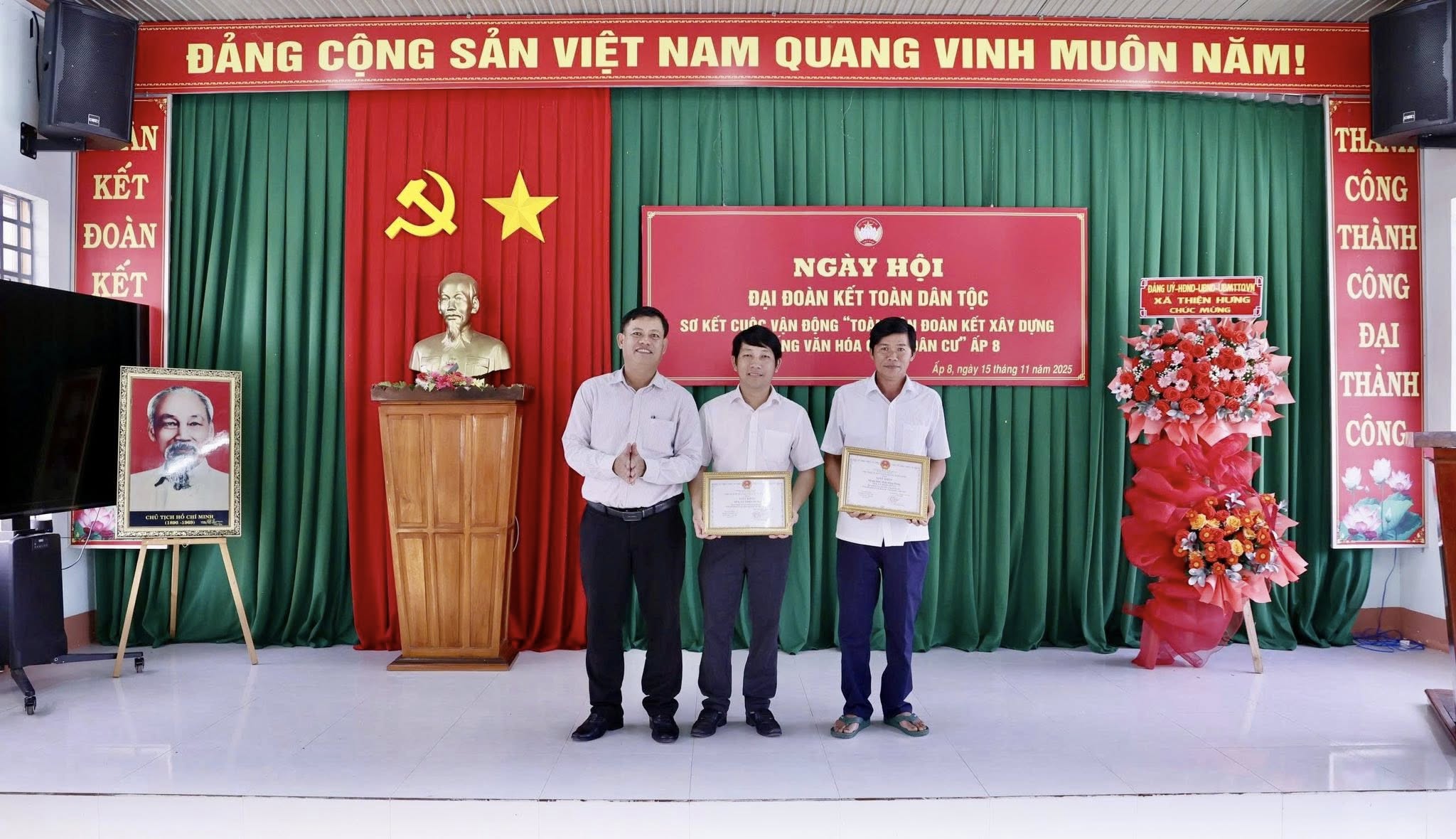Dịp này UBND xã Thiện Hưng tặng giấy khen 01 tập thể 01 cá nhân có thành tích cuộc vận động toàn dân đoàn kết xây dựng đời sống văn hoá khu dân cư năm 2025.