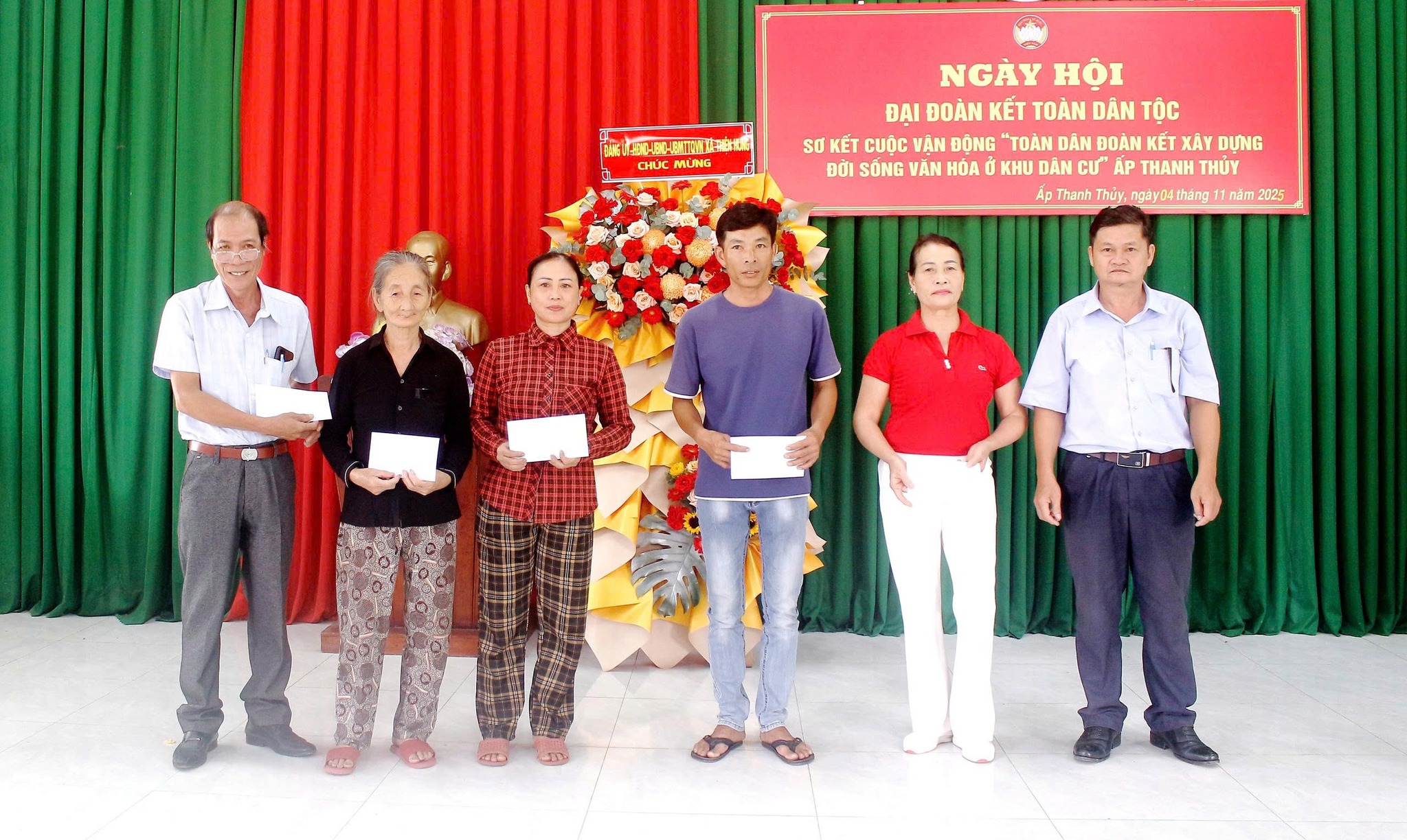 Tại Ngày hội, các đại biểu và nhân dân cùng nhau ôn lại truyền thống vẻ vang của Mặt trận Tổ quốc Việt Nam, đánh giá kết quả thực hiện khối đại đoàn kết toàn dân tộc, các cuộc vận động và phong trào thi đua yêu nước ở cộng đồng dân cư ấp Thanh Thủy trong năm qua, cụ thể: Theo báo cáo, ấp Thanh Thủy hiện có 492 hộ dân, trong đó 479/492 hộ đạt danh hiệu “Gia đình văn hóa”, chiếm tỷ lệ 97,4%. Trong năm, ấp đã tiếp nhận và vận động các nhà hảo tâm và doanh nghiệp trên địa bàn ấp hỗ trợ hơn 650 phần quà với tổng trị giá trên 70 triệu đồng cho gia đình chính sách, hộ nghèo, hộ cận nghèo, hộ khó khăn, người già neo đơn, trẻ em mồ côi… nhân dịp Tết Nguyên đán, Tết Trung thu và các dịp lễ trong năm.