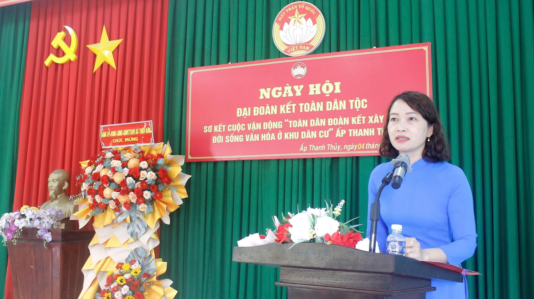 Phát biểu tại Ngày hội, đồng chí Đỗ Thị Như – Phó Bí thư Thường trực Đảng ủy xã Thiện Hưng biểu dương những kết quả mà cán bộ, nhân dân ấp Thanh Thủy đã đạt được trong thời gian qua; đồng thời mong muốn Ban Công tác Mặt trận và Ban điều hành ấp tiếp tục phát huy tinh thần đoàn kết, phát triển phong trào thi đua yêu nước, xây dựng đời sống văn hóa, góp phần đưa ấp Thanh Thủy ngày càng phát triển toàn diện, bền vững.