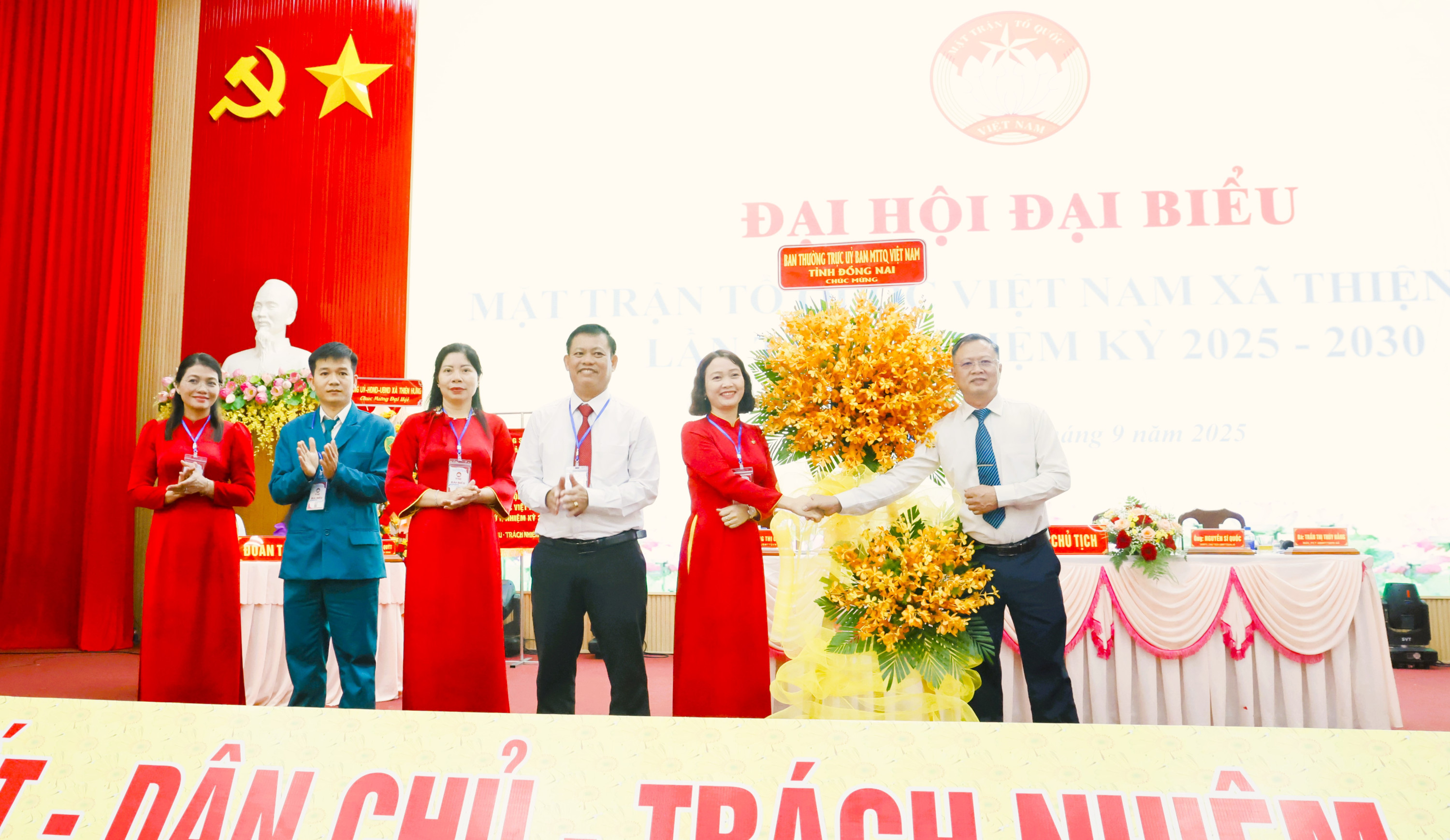Lãnh đạo UBMTTQ Việt Nam tỉnh Đồng Nai và lãnh đạo xã Thiện Hưng tặng hoa chúc mừng các Uỷ viên UBMTQ Việt Nam xã Thiện Hưng nhiệm kỳ 2025-2030