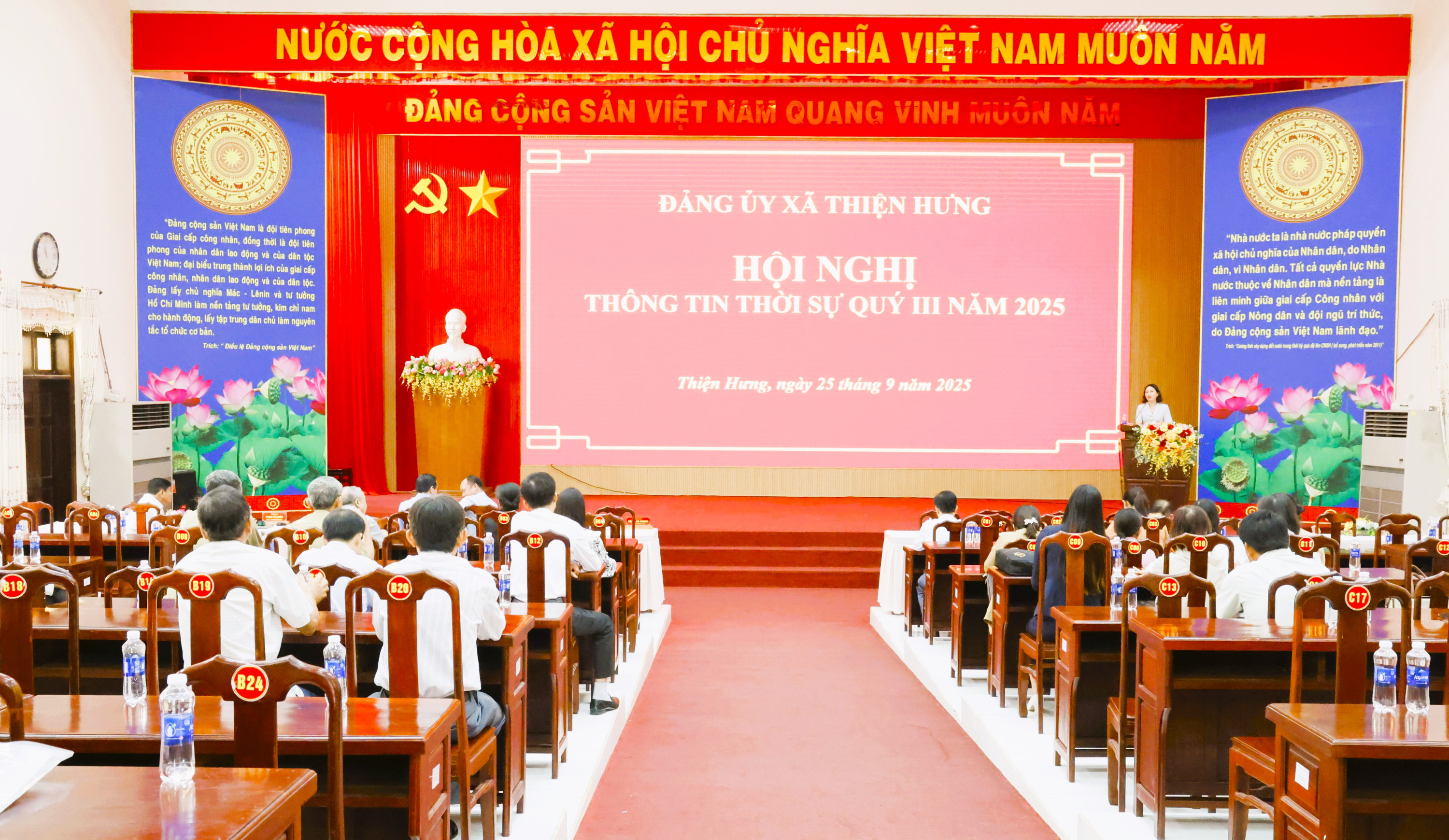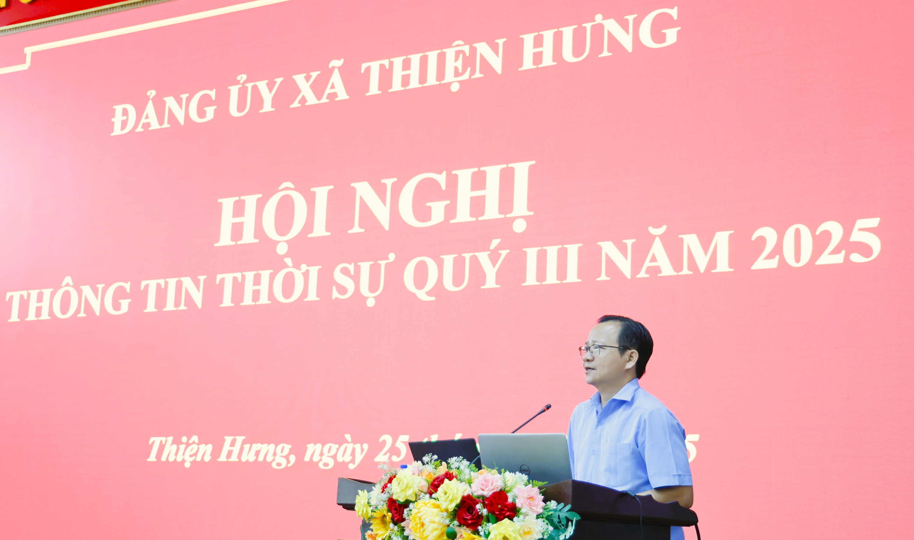 Tại hội nghị, các đại biểu xã Thiện Hưng đã được Báo cáo viên Phan Duy Khiêm – Thạc sỹ, Báo cáo viên Trung ương, Trưởng phòng Thông tin tổng hợp, Ban Tuyên giáo và Dân vận Tỉnh ủy thông tin các chuyên đề: Tình hình thế giới và trong nước nổi bật trong thời gian qua; Kết quả tổ chức sáp nhập và vận hành bộ máy chính quyền địa phương 2 cấp trên đị bàn tỉnh Đồng Nai. Một số nhiệm vụ trọng tâm cần triển khai thực hiện trong thời gian tới; Nghị quyết số 01 ngày 18/8/2025 của Ban Chấp hành Đảng bộ tỉnh Đồng Nai về một số chỉ tiêu, nhiệm vụ, giải pháp chủ yếu phát triển kinh tế - xã hội, quốc phòng - an ninh, xây dựng Đảng, đoàn thể những tháng cuối năm 2025.